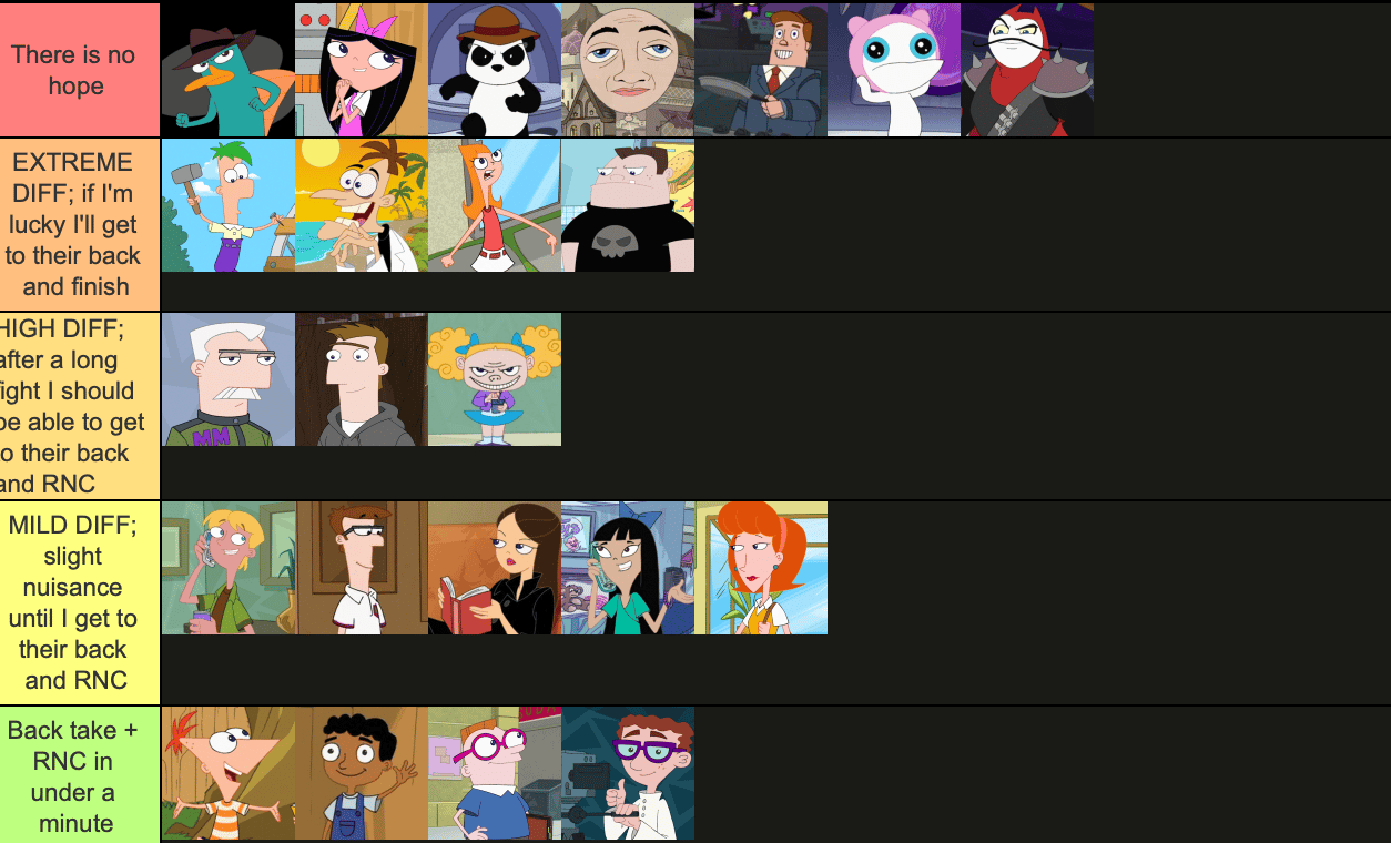 So I compiled all the main (or relevant) characters from my favorite show Phineas and Ferb (in which I have extensive knowledge about), and pitted myself up against them, ranking them by how easily I could submit them via RNC in unarmed combat.