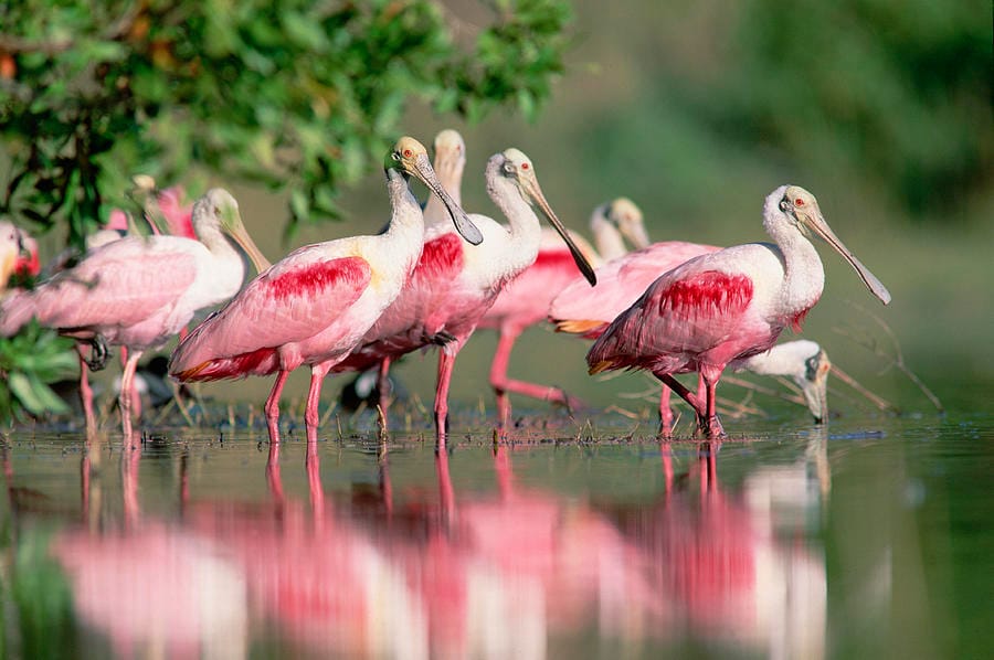 The roseate spoonbill wades in shallow water, and uses its uniquely shaped and very sensitive beak to stir the water to search for small crustaceans to eat. Like flamingos, their diet is what gives them their pink coloration (however, the two species are unrelated).