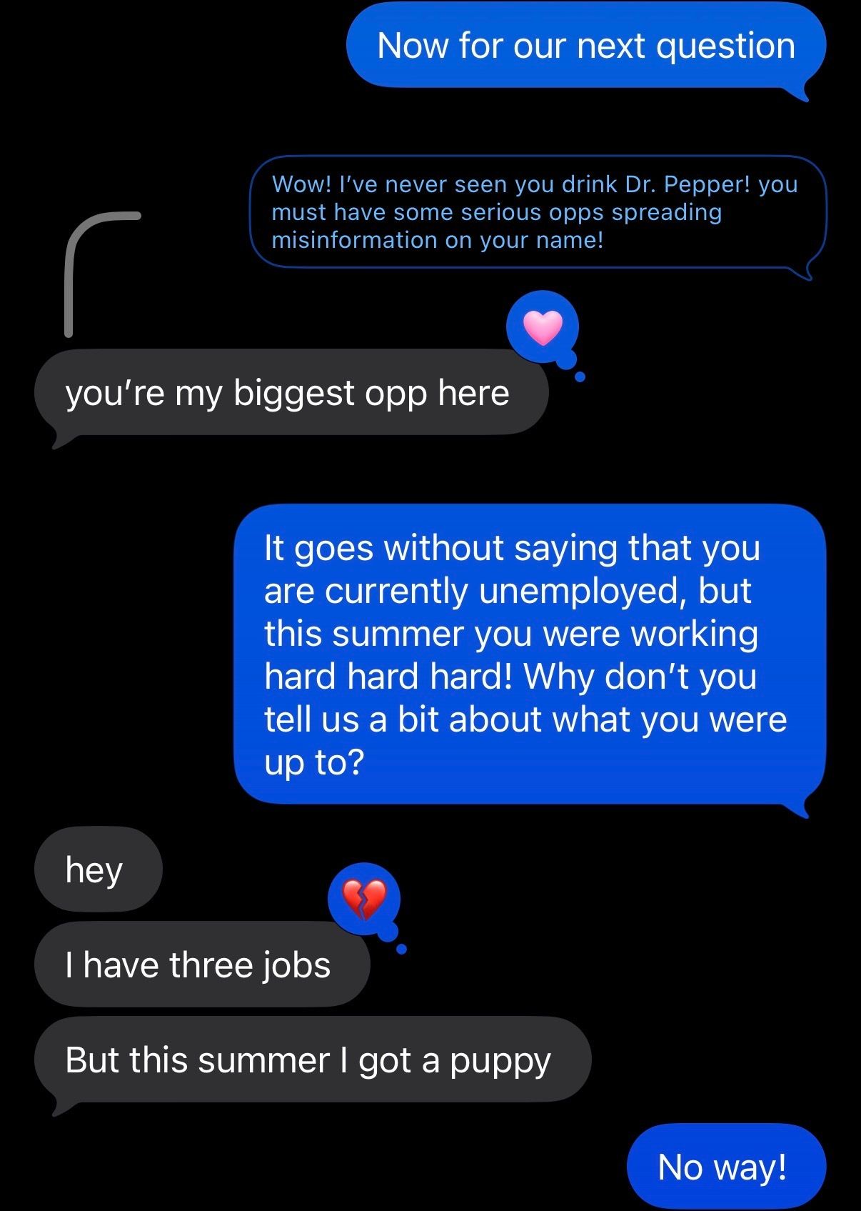 “My dog is pregnant! She’s going to born me three puppies. I will name them Breakfast, Lunch, and Dinner.”