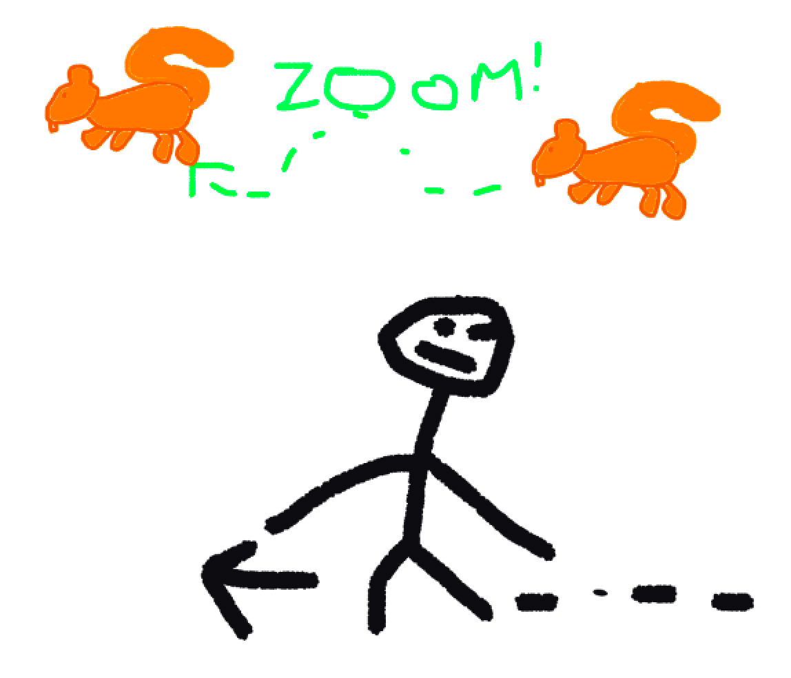“But Nate,” you may be asking, “I see dozens of different squirrels a day, just walking around campus. What do you mean there are only ten squirrels?” This is where we get into the most captivating point of my hypothesis. Imagine this scenario with me: Let’s say you’re walking down the sidewalk, maybe you’re going from class to your suite, or maybe you’re walking your dog around the neighborhood. You see a squirrel, maybe you stop and look, or maybe you just keep walking. Two minutes later, as you’re further along the sidewalk, a squirrel runs across the sidewalk right in front of you, and climbs up into a tree. That could be the same squirrel. My hypothesis proposes that squirrels are far quicker than we have ever imagined, and can move from place to place so fast that we observe them as a new squirrel each time.