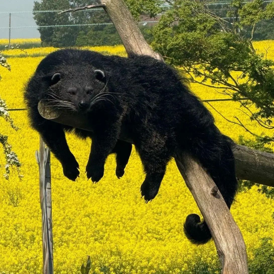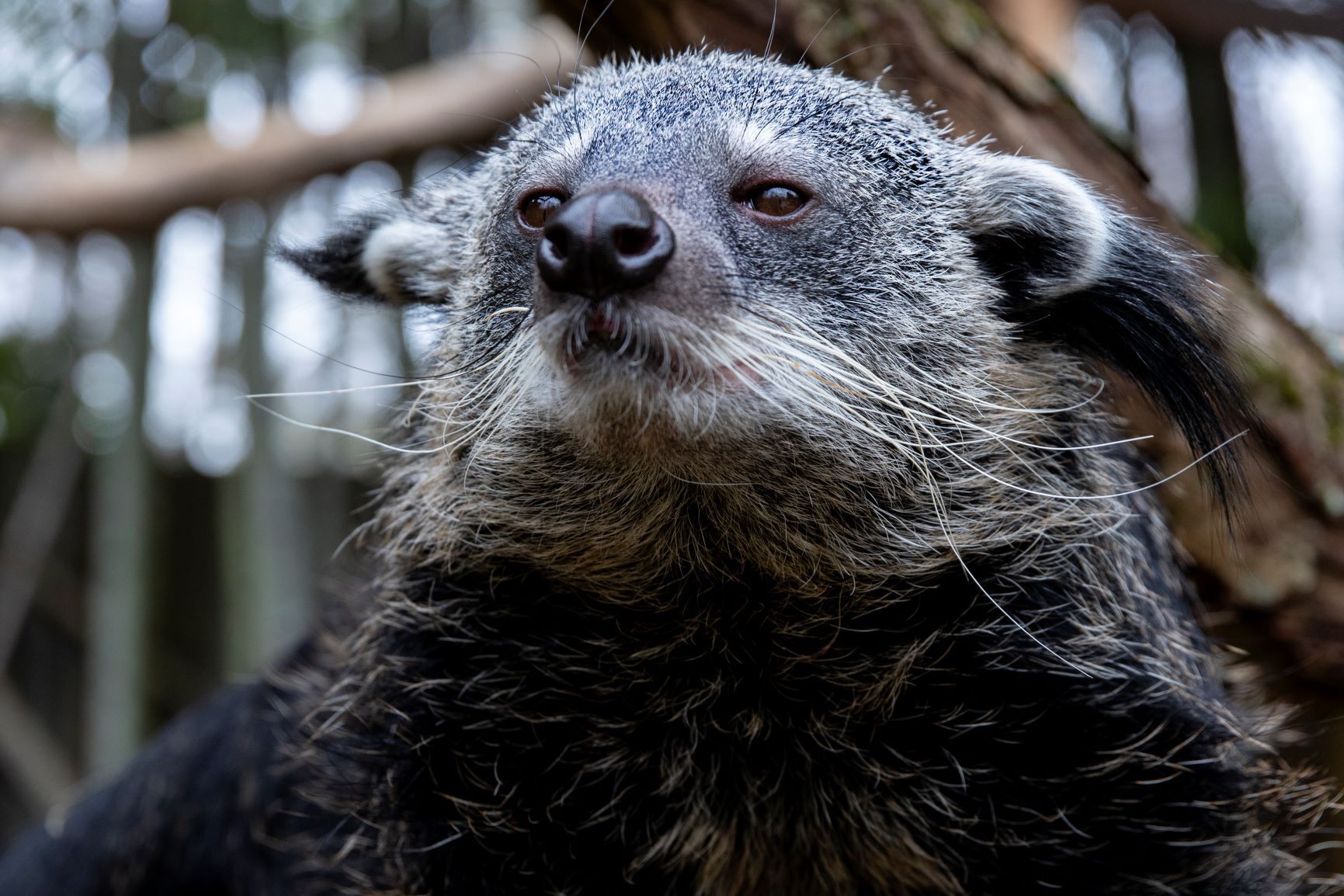Binturongs are commonly called bear-cats, and their scientific name, artcictis, means “bear-weasel”. They share some traits with bears like walking on bare, flat feet, having an omnivorous diet, and a crepuscular sleep cycle. But they are not related to bears at all!