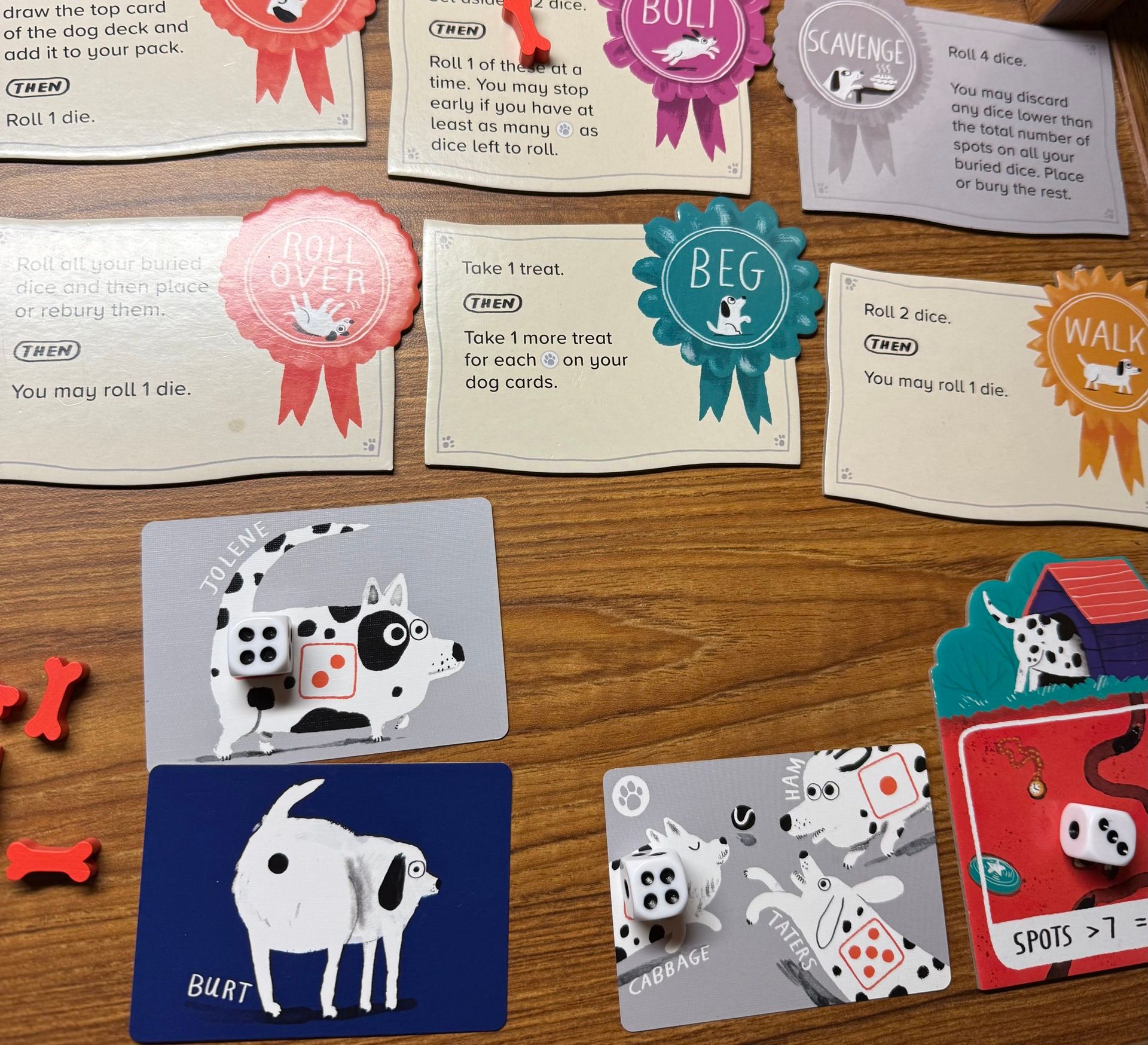 At the start of your turn, you choose one of the 6 trick cards, and do whatever action it tells you to do. This may include rolling dice, grabbing treats (which are used to re-roll dice), or some other strange thing. If you roll a dice and can’t place it anywhere, it gets dug in the doghouse! Dig over 7 spots, and you bust! Losing all your progress.