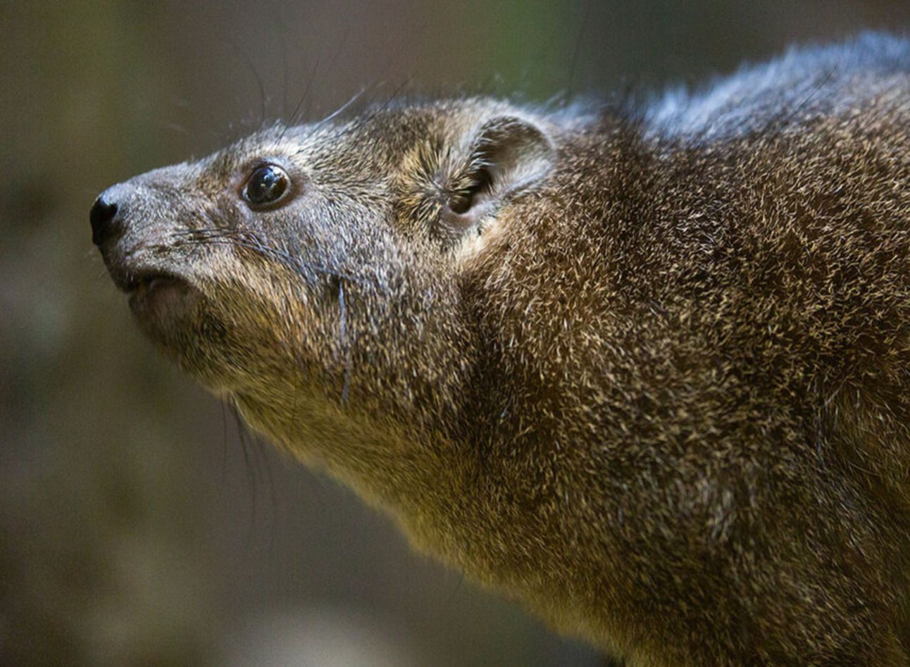 Hyraxes are unique in that their iris slightly protrudes over the pupil of their eye. This decreases the amount of light to the eye from above, serving as a built-in sun visor.