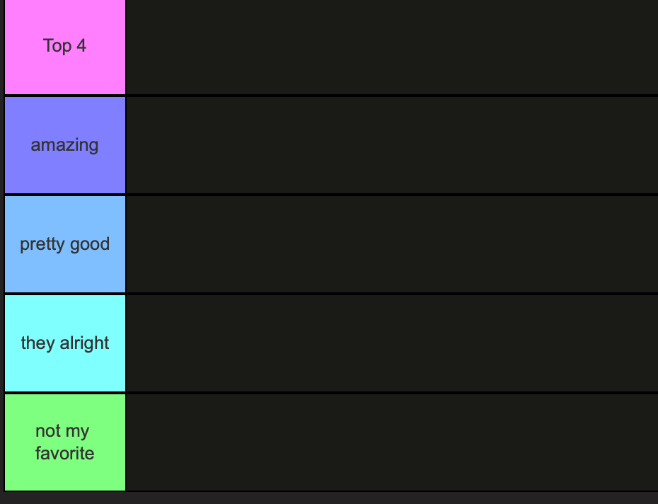 Separated into 5 tiers, from bottom to top the tiers are titled: not my favorite, they alright, pretty good, amazing, and finally, the supremely coveted top 4 ranking. (Final tier list will be at the end, I aint spoilin!)