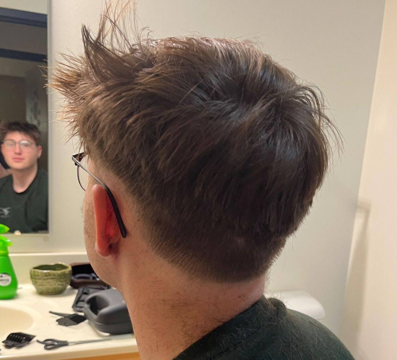 After a long time snipping and buzzing away, I was satisfied enough with the back and sides, and went to work on the top.