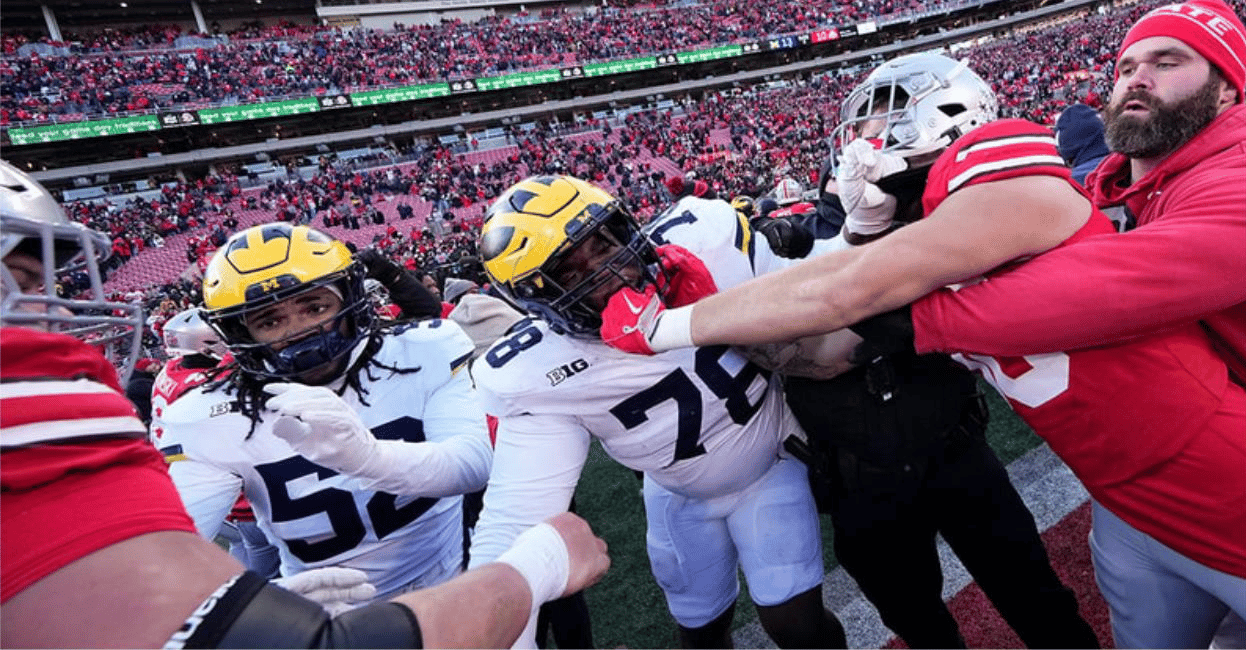 But those wins weren’t the highlight of the weekend. It was...the fights? Rivalry weekend is usually tense and once in a while a punch might get thrown. But there were at least 6 or 7 games with huge fights breaking out! In that Michigan @ Ohio State game, Michigan tried to plant its flag into the middle of Ohio State’s field on the logo after the win, which is seen as extremely disrespectful. The players weren’t having it, and a MASSIVE fight broke out, which took about 20 minutes to settle down completely. It was insanity