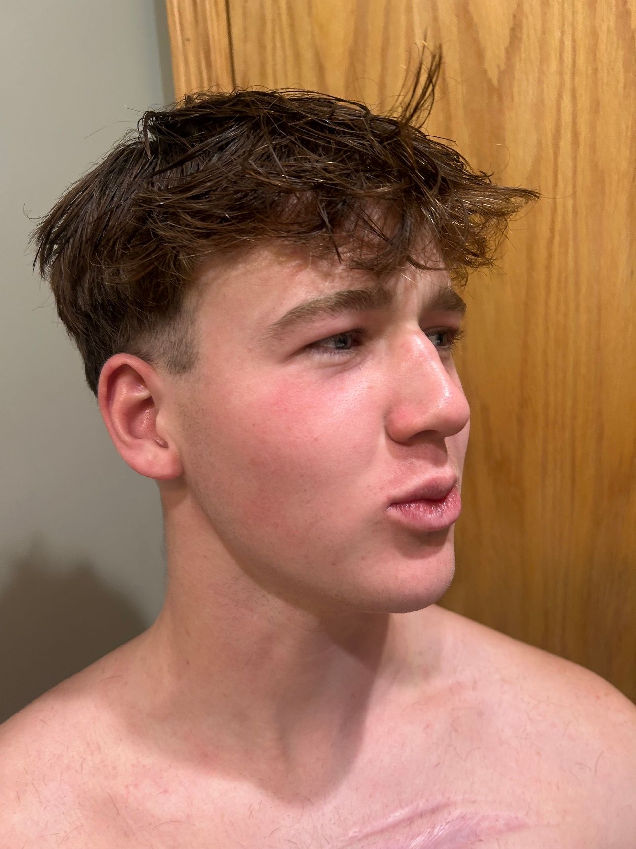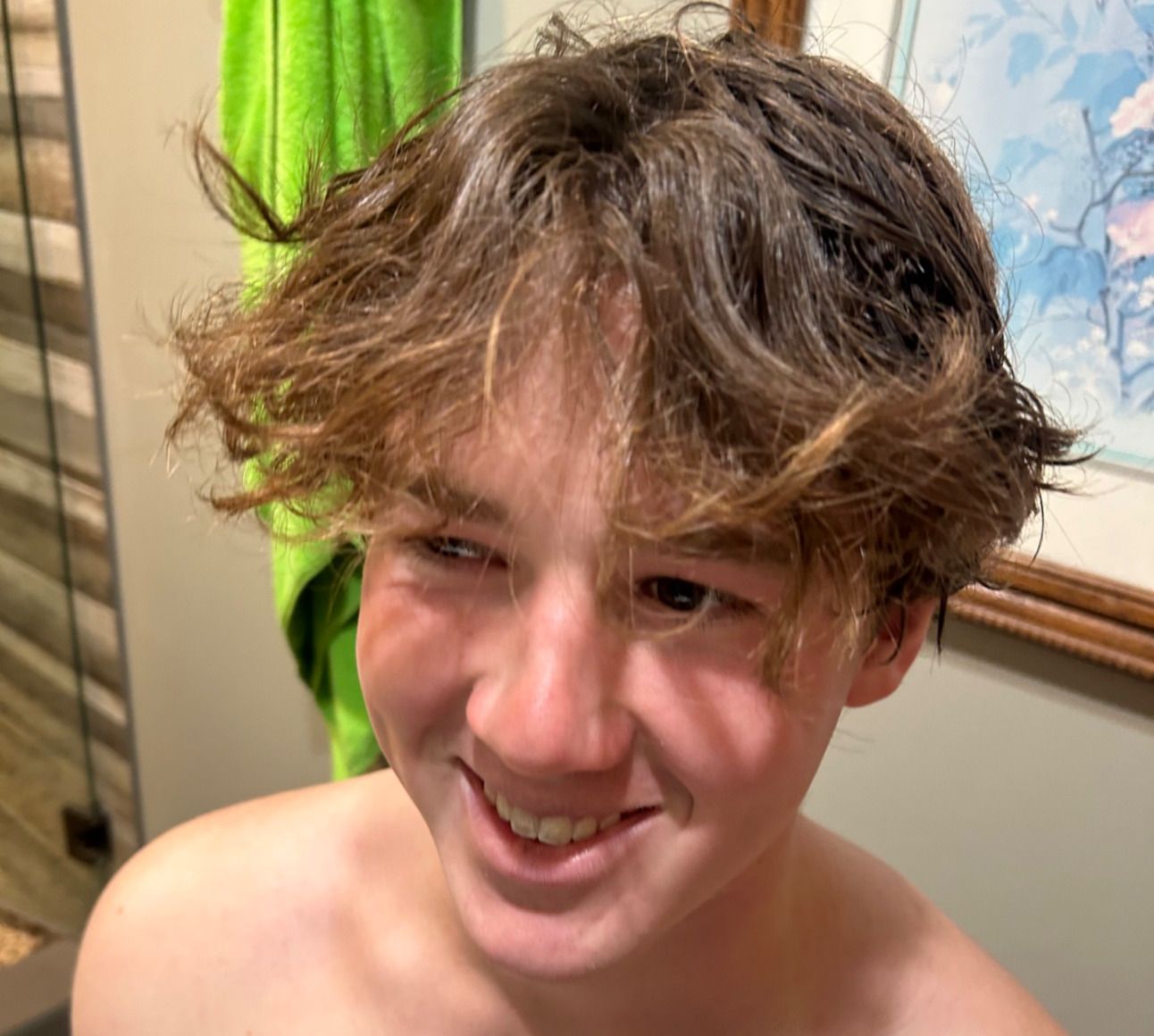Then I went to work on the top and back with my scissors, with him constantly switching from “do what you want bro I don’t care, whatever you do it will grow back” to “WHY IS SO MUCH HAIR FALLING.” I asked if he wanted to go any shorter on the back, and he said no. Finished with going along the top with some thinning scissors, just to get some of the thickness under control, and then we were done!