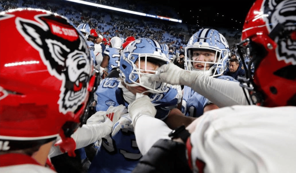 And in the North Carolina State (NC State) @ UNC (University of North Carolina) game, NC State won 35-30, looking to celebrate with yet ANOTHER flag planting on UNC’s logo! And, of course, another fight broke out which took a long time to settle.
