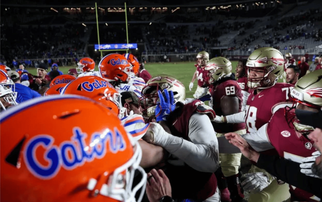 But that was only one of the many flag-stamps that were attempted this weekend. In the Florida State @ Florida game, Florida won 31-11 and tried celebrating on Florida State’s logo, which led to a huge fight yet again.