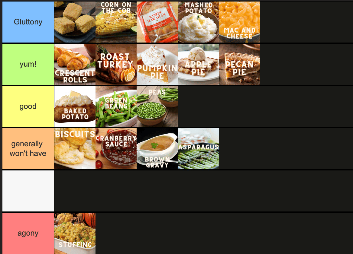 Alright we are SO back with another tier list. It’s Thanksgiving, so naturally, Thanksgiving Food Tier List! I will only be ranking the foods that are either a) frequently at our family’s gathering, or b) foods that are common enough that I feel comfortable putting them on a tier list, even if they don’t make frequent appearances at our Thanksgiving dinner.