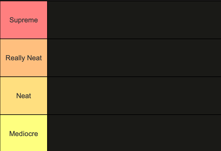 Green - The color of peace, nature, and serenity. Green sits unrivaled at the top of the really neat tier. There is something so enchanting about green, with its gentleness and kindness. Green has some of the highest highs, but also the lowest lows. Over the past few centuries, green has dipped, HARD. We see the bright, blaring greens of the electronic age. The checkmarks, the dollar, the green lights at stoplights, the Spotify logo, it’s all crashing down. Green is transitioning from a color of the natural world, to a color of consumerism, and for this, I fear the great green has fallen from it’s once great peak.