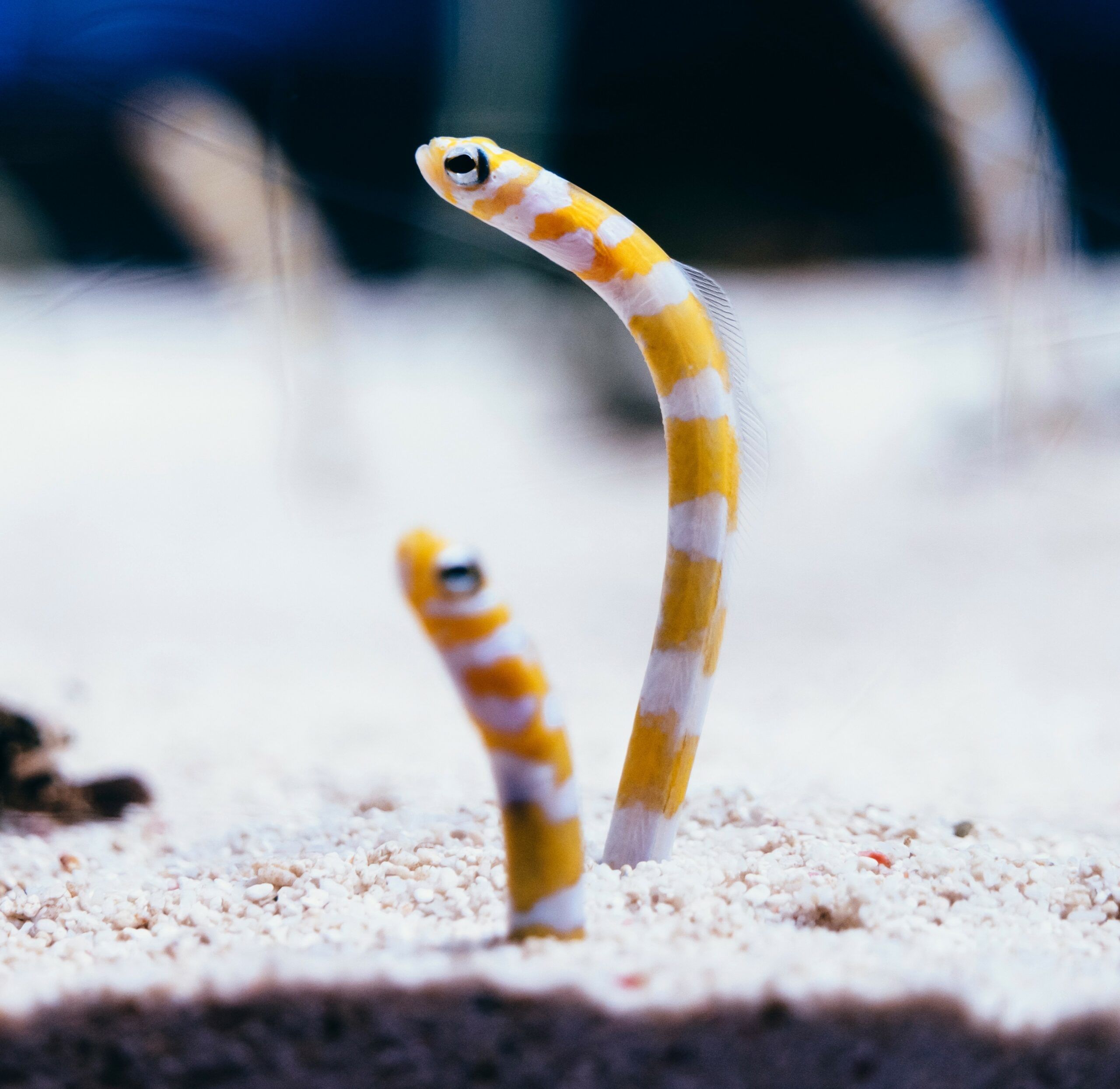 Garden Eels are small, shy, harmless fish who grow up to 16 inches long. Most of their body is anchored down in the slimy, sandy burrows they dig into with their pointy tail.