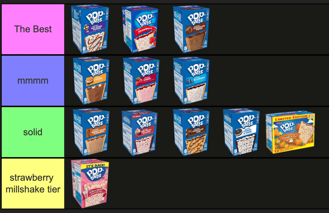 I had a lot of fun last week with the cereal tier list, and it sparked some fruitful controversy! So I’m back with another tier list, this time with Pop Tarts!