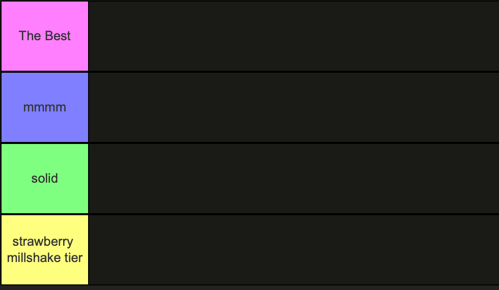 As you can see, this time we only have 4 tiers: The Best, mmmm, solid, and strawberry milkshake tier. There isn’t really a bad tier, I like just about everything on this list, so just because it’s in the “solid” tier, doesn’t mean I dislike it, it just means I like other flavors more. So let’s dive in!